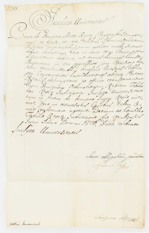 Leírás: 1786 Végh Péter (1723-1807) koronaügyész, tárnokmester, kir. személynök hivatalos levele latin nyelven, sajátkezű aláírásával, papírfelzettel, sérült