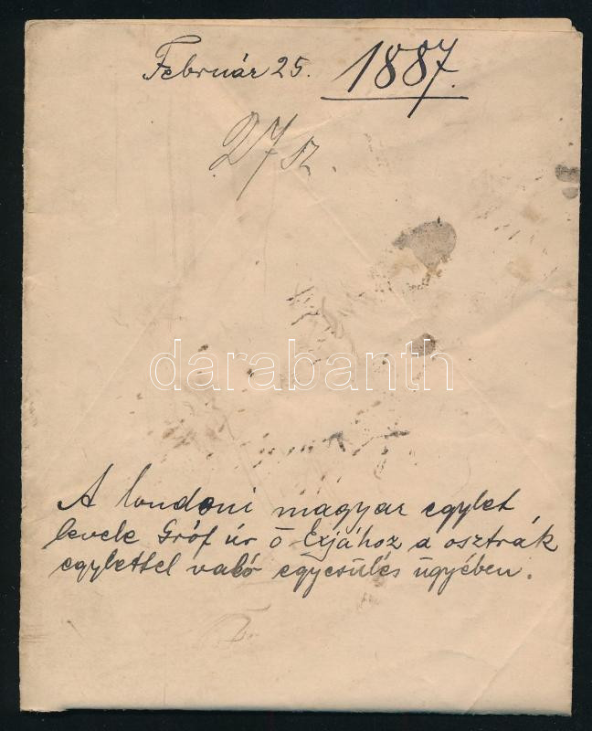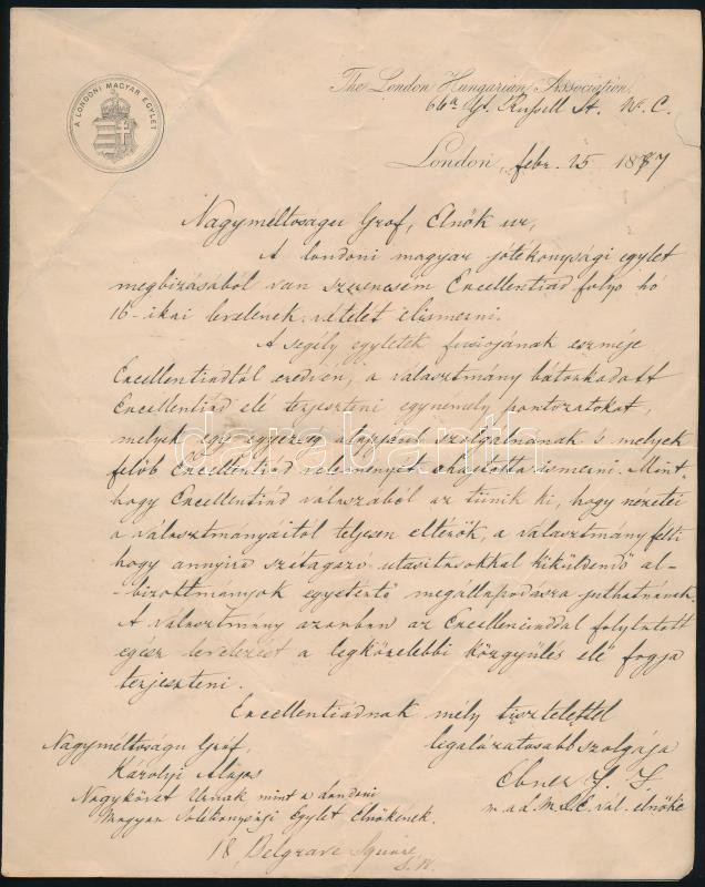 1887 Ébner Lajos, a Londoni Magyar Egylet választmányi elnökének levele gróf Károlyi Alajos (1825-1889) londoni nagykövethez, egy kézzel írt oldal, fejléces papíron, apró lapszéli sérüléssel