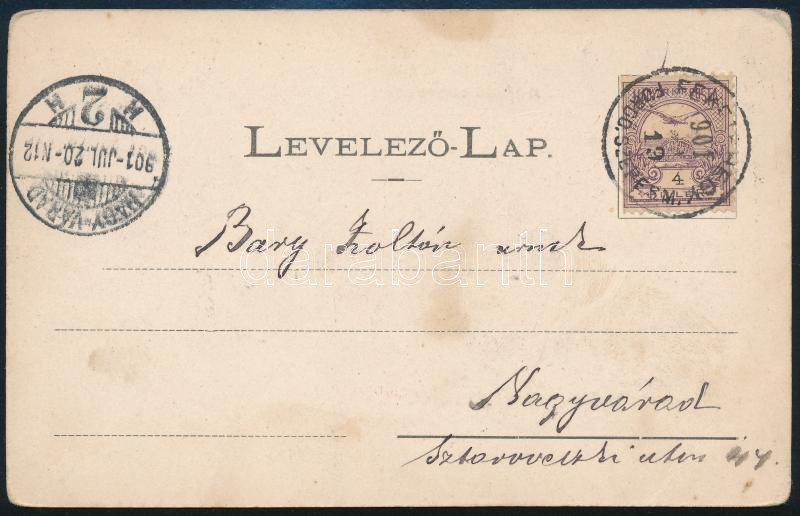 1901 Bary József (1858-1915), a tiszaeszlári vérvádper vizsgálóbírója, kúriai bíró autográf sorai Bary Zoltán (1892-1986) m. kir. kúriai bíróhoz, Fekete-fürdőt megörökítő képeslapon,