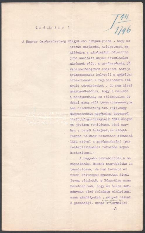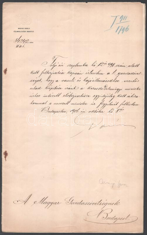 1909 Darányi Ignác (1849-1927) földművelésügyi miniszter autográf aláÃrásával ellátott levél, fejléces papÃron és hozzá kötÅ‘dÅ‘ indÃtvány, Pallavicini Ede, Å‘rgróf (1845-1914) közgazdász és politikus, a fÅ‘rendi ház tagja autográf aláÃrásával, más egyéb hozzá kapcsolódó Magyar Gazdaszövetség irat.