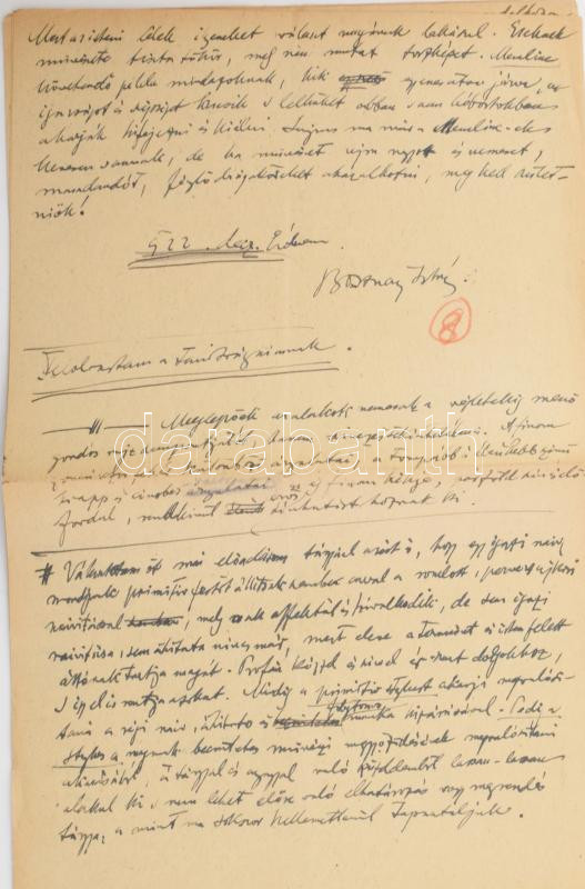 1922 Bosznay István (1868-1944) festőművész, főiskolai tanár autográf kézirata, a Képzőművészeti Főiskola hallgatói számára felolvasott előadásának vázlata, 8 beírt oldal, az utolsó oldalon Bosznay István aláírásával, illetve az előadás felolvasása utáni reflexióival