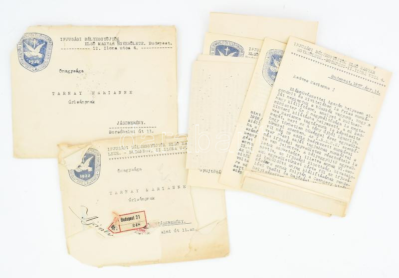 1926 - 1927 Ifjusági Bélyeggyűjtők Első Magyar Egyesületének 7 db gépelt levele, 2 borítékkal, a vezető tanár autográf aláírásaival, valamint egy levélen a titkár Harmath István, és Fülöp László ifjusági elnök aláírásaival. Egy kivételével fejléces papírokon, az egyik boríték sérült, hiányos.