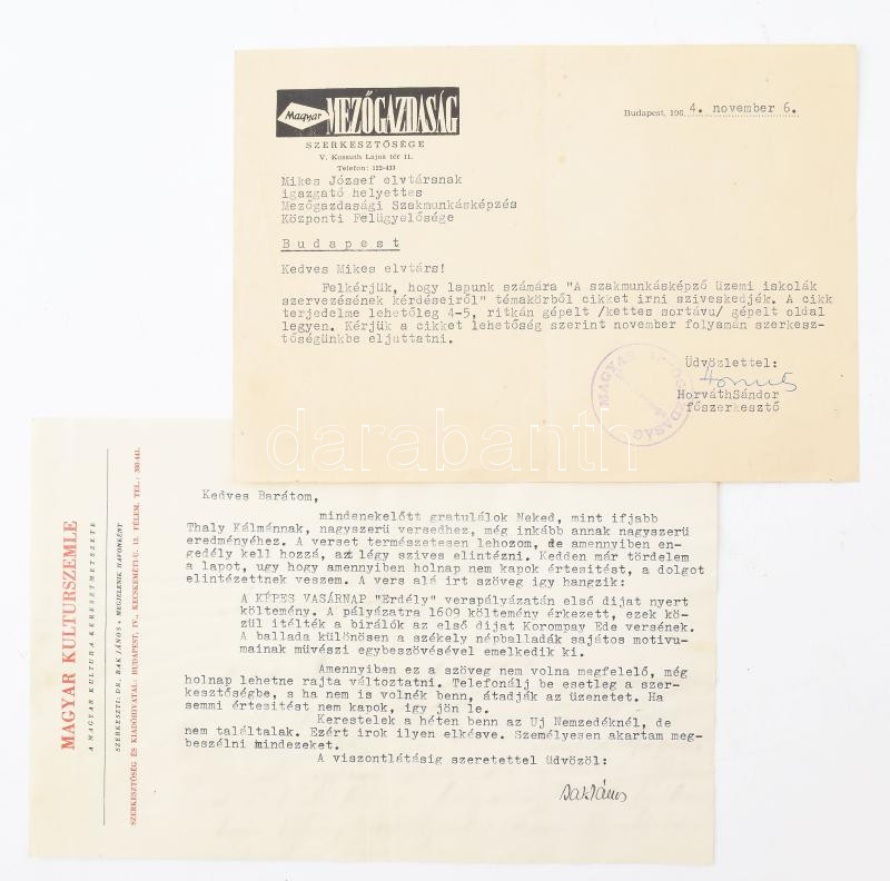 Leírás: 1941, 2 db szerkesztőségi levél Bak János (1913-1981): festőművész, grafikus Magyar Kultúrszemle c. lap. Horváth Sándor Mezőgazdaság c, lap