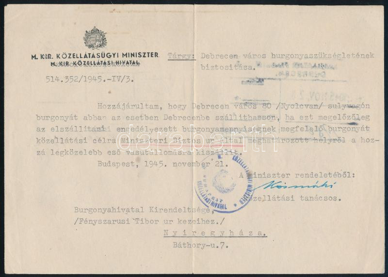 1945 M. Kir. Közellátásügyi Miniszter M. Kir Közellátási Hivatalának hozzájárulása 80 vagon burgonya Debrecenbe való szállításáról, beazonosítandó aláírással, fejléces papíron, hátoldalán Hajdú Vármegye és Debrecen Sz. Kir. Város Főispán és más bélyegzőjével,