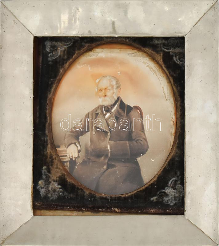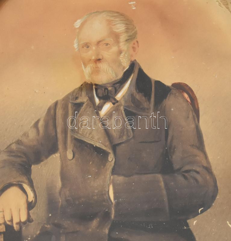 cca 1860 Magyary-Kossa Sámuel (1781-1866), Tolna megye első alispánja portréja. Akvarell, papír, jelzés nélkül. Üvegezett fém keretben, antik szövetborítású paszpartuban. Lapszéli kisebb szakadásokkal. 20x16 cm