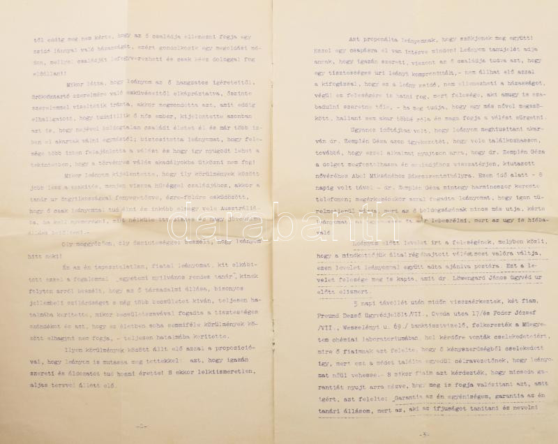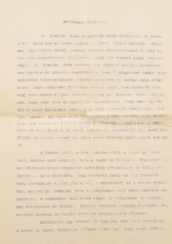 cca 1913-1915 Freund Lázár zsidó vallású budapesti lakos levele a József Műegyetem rektorának, amelyben panaszt tesz Zemplén Géza (1883-1956) vegyész, bölcseleti doktor, műegyetemi tanár (ő volt az egyetem 1913-ban felállított szerves kémia tanszékének vezetője) ellen, miután az házasság ígéretével elcsábította ,,22 éves, viruló szépségű" lányát, majd ígéretét és szavát megszegve ,,gyászt, szomoruságot és helyrehozhatatlan megalázást" hozott családjukra. 6 gépelt oldal, Freund Lázár aláírásával.