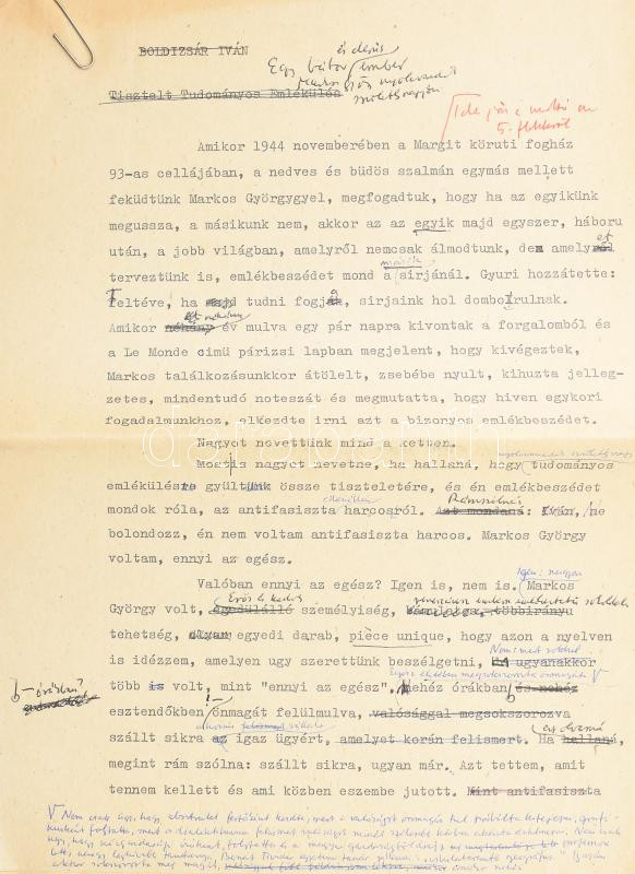 cca 1982 Boldizsár Iván: ,,Tisztelt tudományos emlékülés". Megemlékezés Markos György (1902-1976) geográfus, újságíró, egyetemi tanár 80. születésnapja alkalmából. Gépirat, 5 p. Boldizsár Iván (1912-1988) Kossuth- és József Attila-díjas író, újságíró, politikus autográf aláírásával, illetve javításaival, kiegészítéseivel.