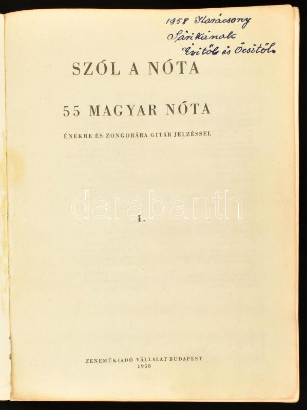 Leírás: Szól a nóta. 55 magyar nóta énekhangra és zongorára. I-II. köt. Bp., 1958, Zeneműkiadó. Kiadói papírkötés, sérült, foltos borítóval, ajándékozási bejegyzéssel.