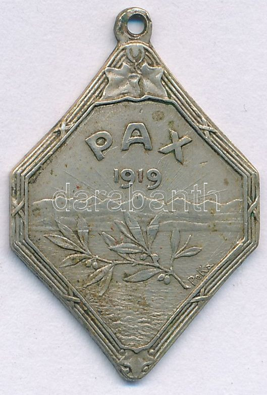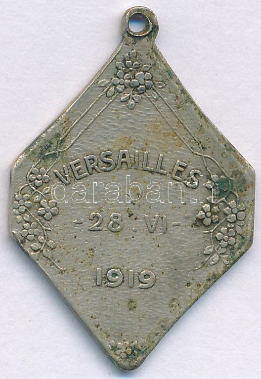 az első világháborút lezáró békekötés emlékére készült fehérfém medál (31x21mm) T:XF patina