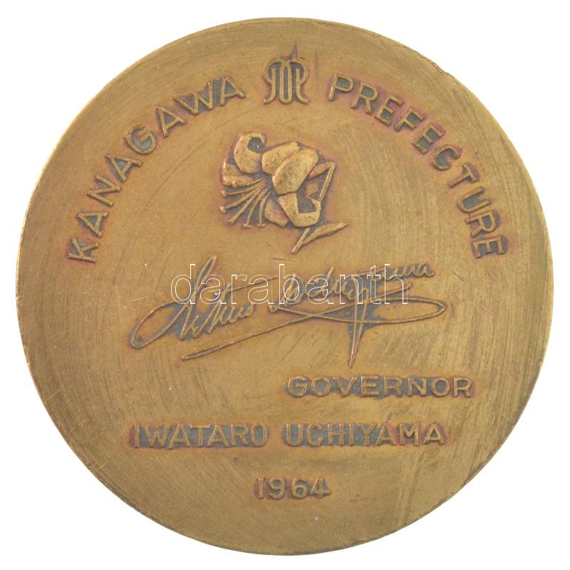 Japán 1964. "Kanagawa prefektúra - Iwataro Uchiyama kormányzó" kétoldalas bronz emlékérem eredeti dísztokban. Iwataro Uchiyama (1890-1971) 1912-ben csatlakozott a Külügyminisztériumhoz, ahol kinevezték a spanyol követség titkárának. 1943-ig dolgozott a külügynél, több mint 20 évet töltött Dél-Amerikában. 1947-től húsz éven át töltötte be a kanagawai prefektúra kormányzói tisztségét, eközben vezette az Ázsiai Jó Szomszédok Mozgalmat, amelynek célja a délkelet-ázsiai országokkal való kapcsolatok javítása volt, illetve a Fülöp-szigeteknél is közbenjárt, mivel az ország blokkolta a japán ENSZ-csatlakozást. (40mm) T:AU Japan 1964. "Kanagawa Prefecture - Governor Iwataro Uchiyama" double-sided bronze commemorative medal in original decorative case. Iwataro Uchiyama (1890-1971) joined the Ministry of Foreign Affairs in 1912 and was appointed secretary of the Spanish embassy. He worked at the Foreign Ministry until 1943, spending more than 20 years in South America. From 1947, he held the position of governor of Kanagawa prefecture for twenty years, during which he led the Asian Good Neighbors Movement, whose aim was to improve relations with Southeast Asian countries, and also intervened with the Philippines, as the country blocked the Japanese UN connection. (40mm) C:AU