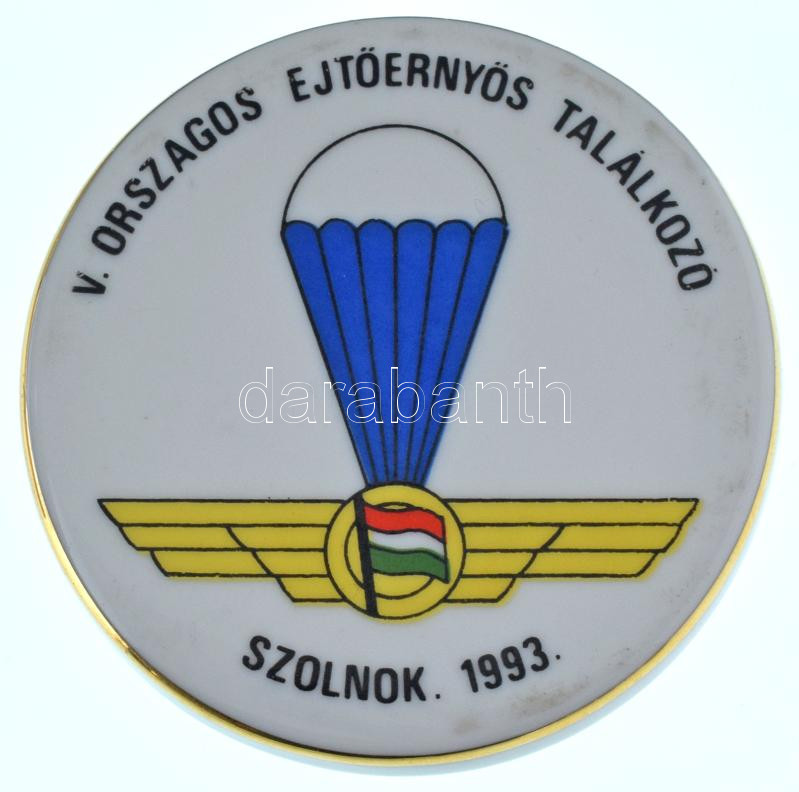Leírás: 1993. "V. Országos Ejtőernyős Találkozó - Szolnok 1993" festett, hátoldalon jelzett Hollóházi porcelán plakett (64mm) T:AU