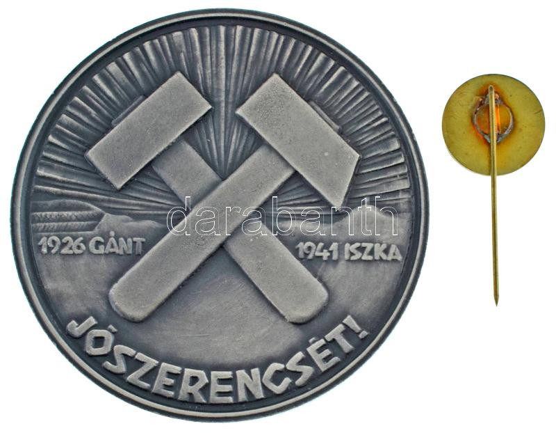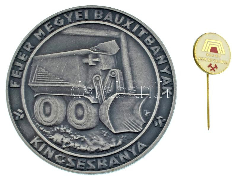 ~1970. "Fejér Megyei Bauxitbányák - Kincsesbánya / 1926 Gánt - 1941 Iszka - Jószerencsét" ezüstpatinázott fém emlékérem, eredeti tokban, mellé műgyantás "Bauxit Kincsesbánya" jelvény (70mm) T:AU