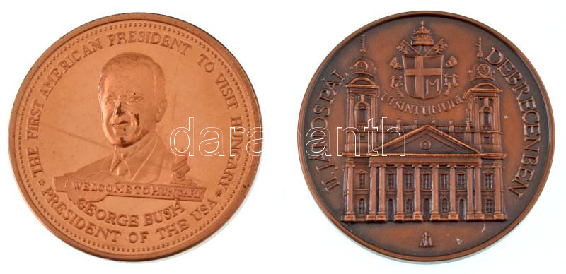 Bozó Gyula (1913-2004) 1989. "George Bush látogatása Magyarországon" kétoldalas bronz emlékérem (42,5mm) + Fritz Mihály (1947-) 1991. "II. János Pál Debrecenben / 1038. Augusztus 16. - 1991. Augusztus 16-20." kétoldalas bronz emlékérem (42,5mm) T:AU (eredetileg PP), AU