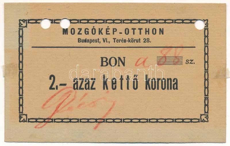 Leírás: Budapest 1919-1925. "Mozgókép-Otthon" bon 2K értékben, kézi sorszámmal és aláírással, lyukasztással érvénytelenítve T:AU fo., kétoldalt falcnyom
