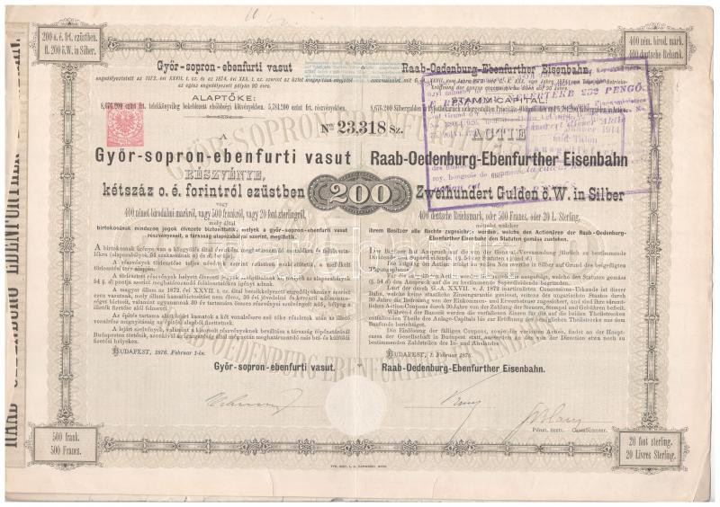 Budapest 1876. "Győr-sopron-ebenfurti vasut" részvénye 200Ft-ról, magyar és német nyelven, szárazpecséttel, bélyegzésekkel és szelvényekkel T:III szakadások / Hungary / Budapest 1876. "Győr-sopron-ebenfurti vasut" share about 200 Forint, hungarian-german bilingual with coupons, embossed stamp and overprints C:F tears