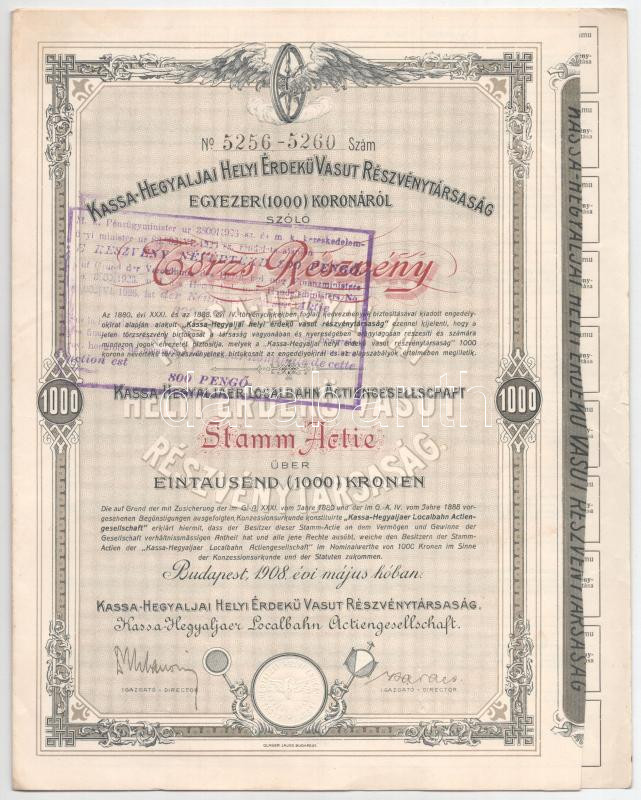 Budapest 1908. "Kassa-Hegyaljai Helyi Érdekű Vasút Részvénytársaság" törzsrészvénye 1000K-ról, magyar és német nyelven, felülbélyegzéssel, szárazpecséttel, vízjeles papíron T:AU / Hungary / Budapest 1908. "Kassa-Hegyaljai Helyi Érdekű Vasút Részvénytársaság" share about 1000 Korona, Hungarian-German bilingual, with cancellation, embossed stamp and watermarked paper C:AU