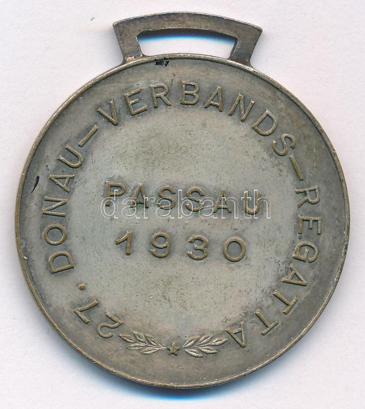 Leírás: Németország 1930. "Duna Egyesületi Regatta - Passau 1930" kétoldalas, ezüstözött bronz evezős díjérem füllel (38mm) T:XF patina