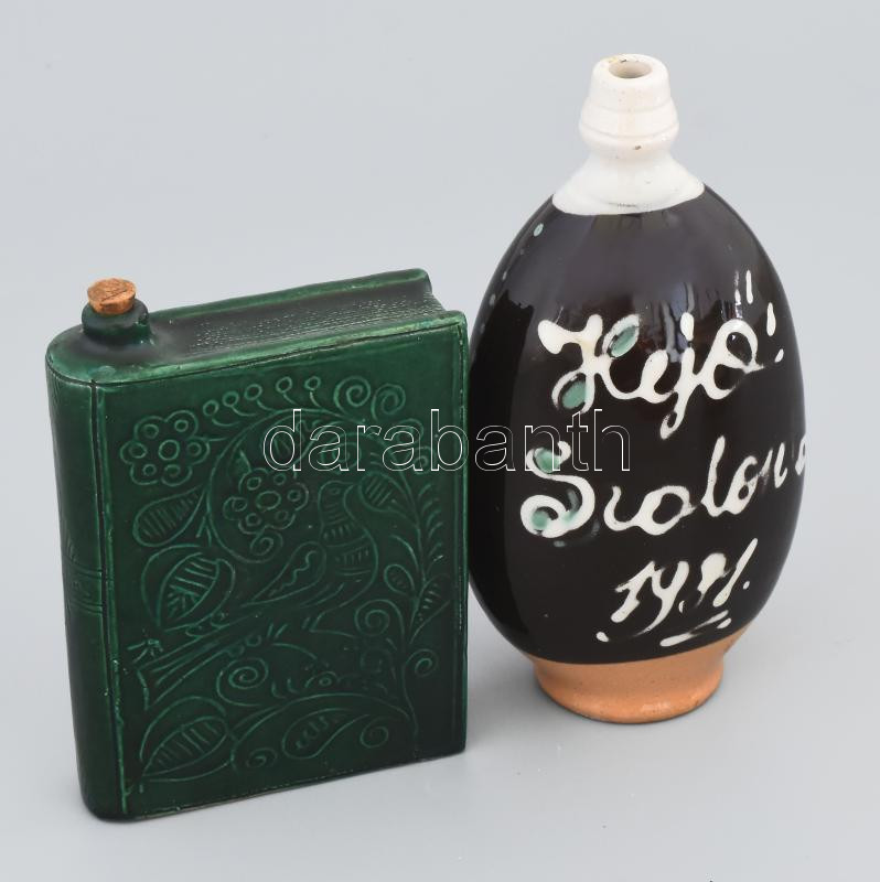 Leírás: 2 darab kerámia butella, egyik könyv alakú. Jelzett, kopással, m: 19 cm alatt