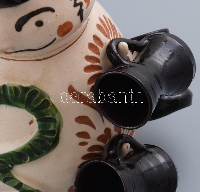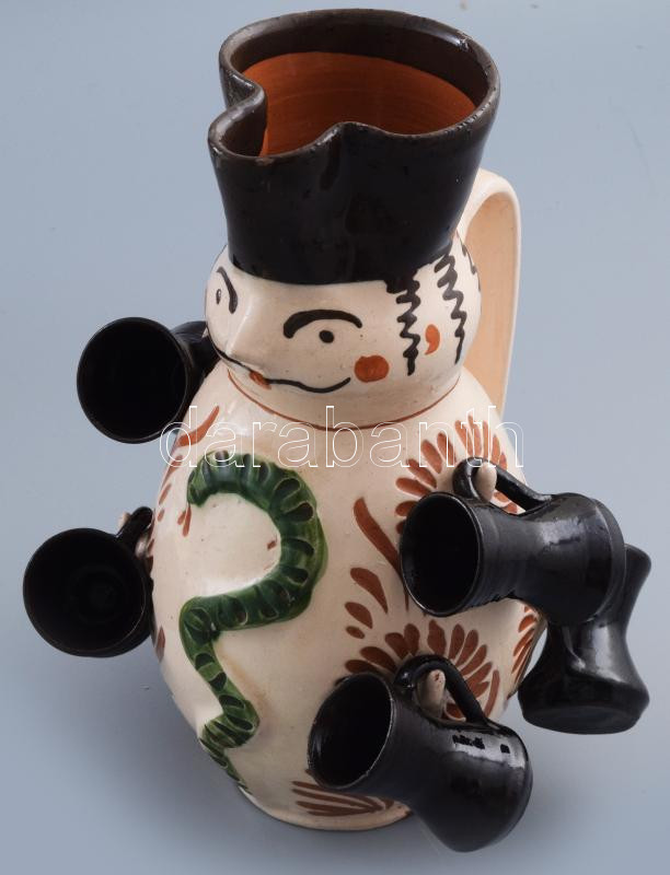 Leírás: Tiszafüredi feliratos miskakancsó, 6 darab ráakasztható kupicával, mázkopással, m: 23,5 cm