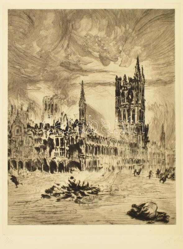 Leírás: E. H. Fehér (?) jelzéssel: Müncheni városháza égése, hidegtű, papír, számozott (18/50), 32x24,5 cm