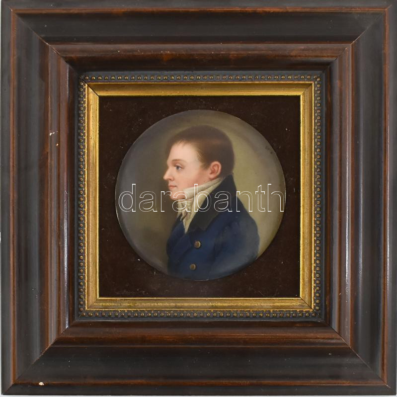 Leírás: Férfi portré. 1866. Porcelánlapra festett kép, dekoratív keretben, hátulján datált, galéria címkéjével, d: 8 cm, kerettel 18x18 cm