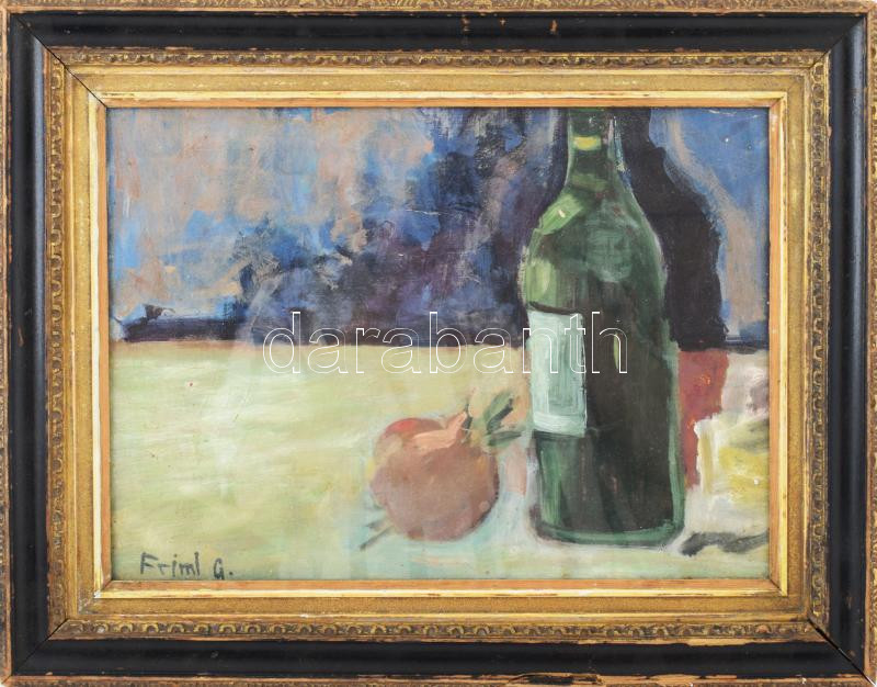 Leírás: Friml G jelzéssel: Csendélet. Olaj, karton. Jelzett. Dekoratív, üvegezett, kissé sérült fakeretben, 27×37 cm