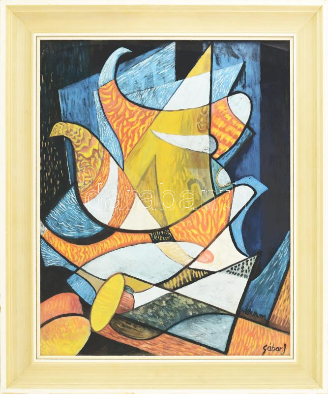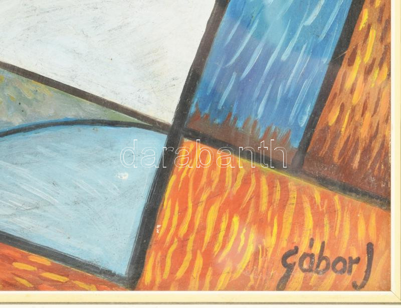 Leírás: Gábor J jelzéssel: Színes formák. Vegyes technika, papír. Dekoratív, üvegezett, kissé sérült fakeretben, 50,5×40,5 cm.