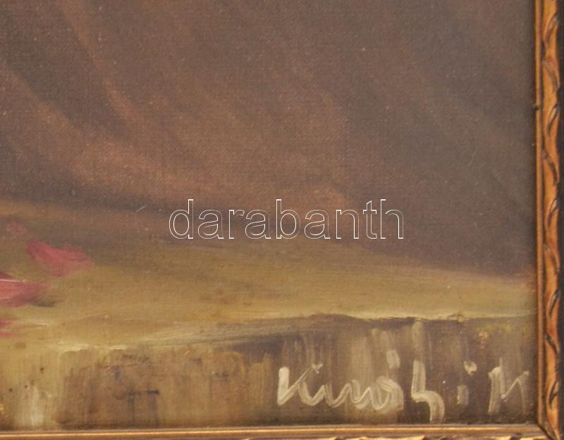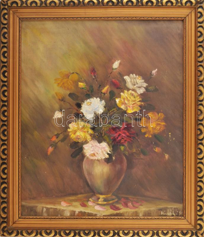 Leírás: Olvashatatlan (Királyi?) jelzéssel: Csendélet. Olaj, vászon, dekoratív fakeretben, 58×48 cm.