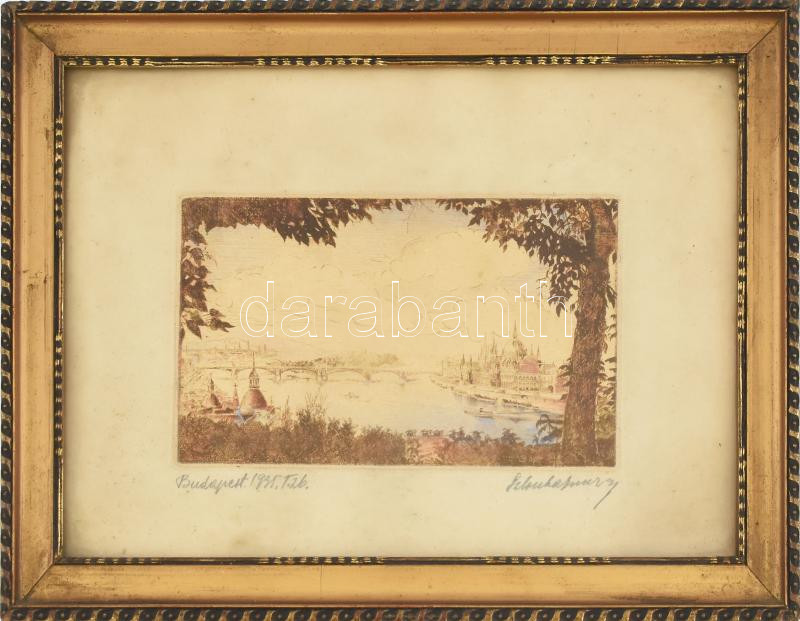 Leírás: Olvashatatlan jelzéssel: Budapesti panoráma, 1935. Akvarellel színezett rézkarc, papír. Üvegezett, dekoratív, korabeli fakeretben. 8x13 cm