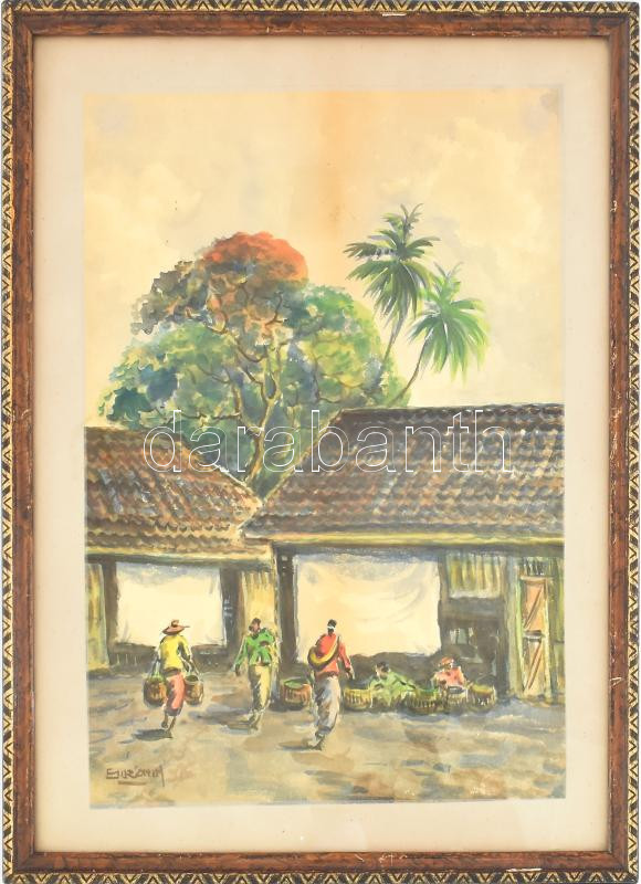 Leírás: Olvashatatlan jelzéssel: Jövés-menés. Akvarell, papír. Dekoratív, üvegezett, kissé sérült fakeretben. 36,5x27 cm.