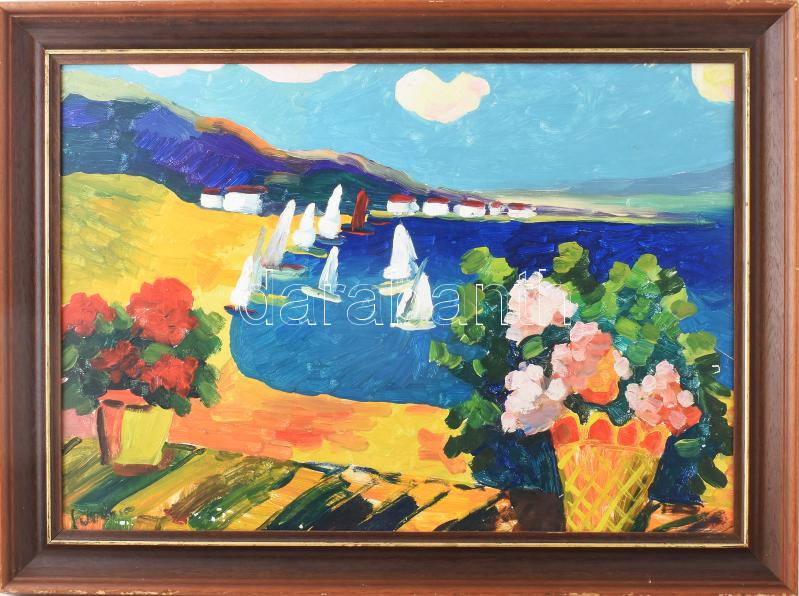 Leírás: Schéner jelzéssel: Vitorlások. Olaj, farost. Apró felületi sérülésekel. Fakeretben, 50×71 cm