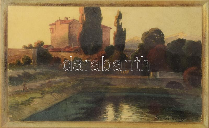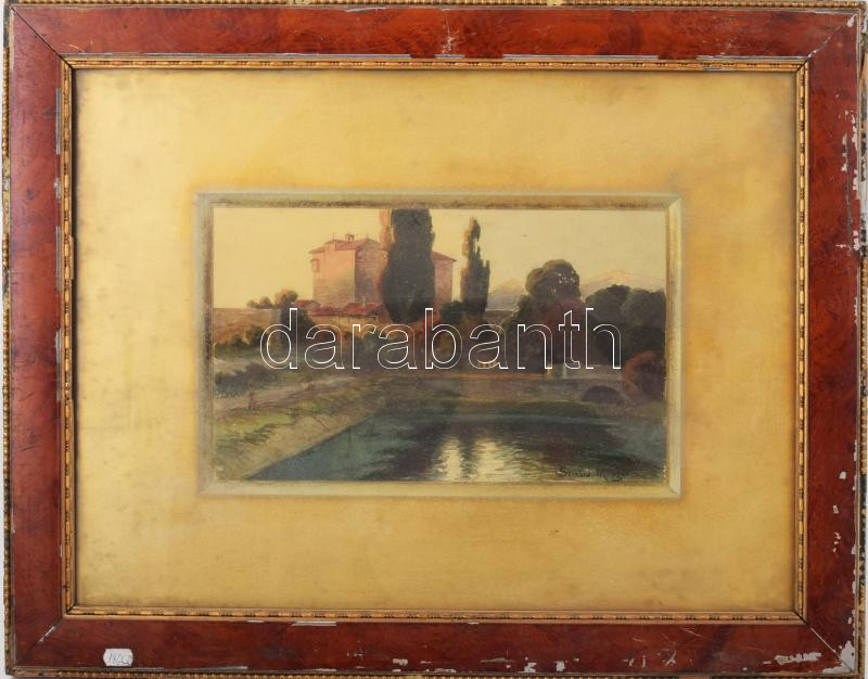 Leírás: Szabó (Miczi?) jelzéssel: Mediterrán táj. Akvarell, papír. Üvegezett, sérült fakeretben. 19x32 cm