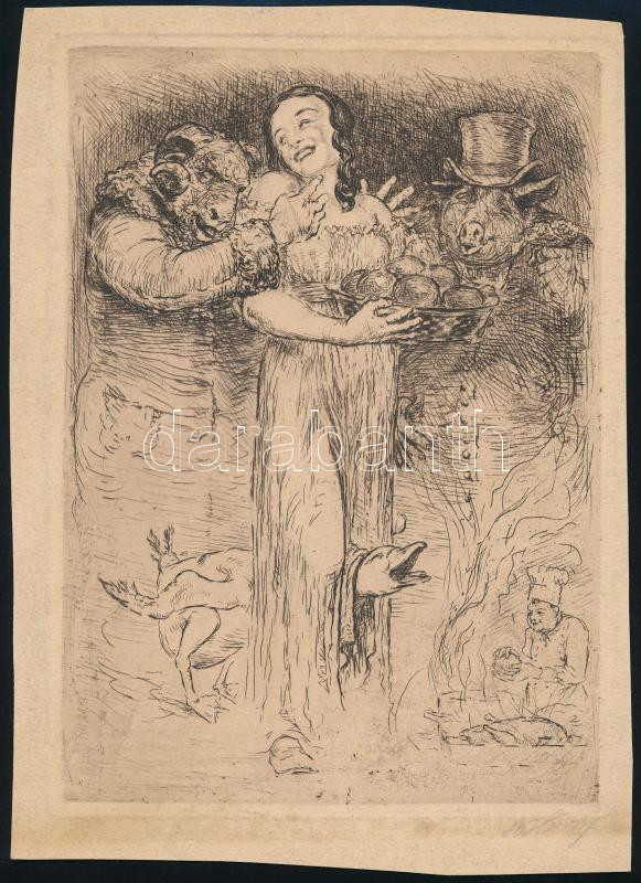 Bruno Héroux (1868-1944): Állati mulatság (cím nélkül). Rézkarc, papír, jelzett, körbevágva, lap széle kissé foltos, 22x16 cm / etching on paper, signed, cut on the edges, slighty stained on the edge od the sheet