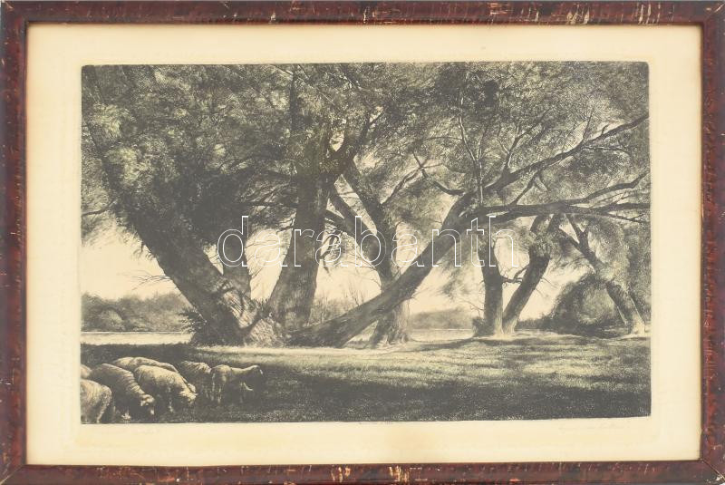 Kaveczky Zoltán (1897-1965): Tiszaparti fűzfák. Színezett rézkarc, papír, jelzett. Lap széle kissé elszíneződött. Kopott üvegezett fakeretben, 27×38 cm