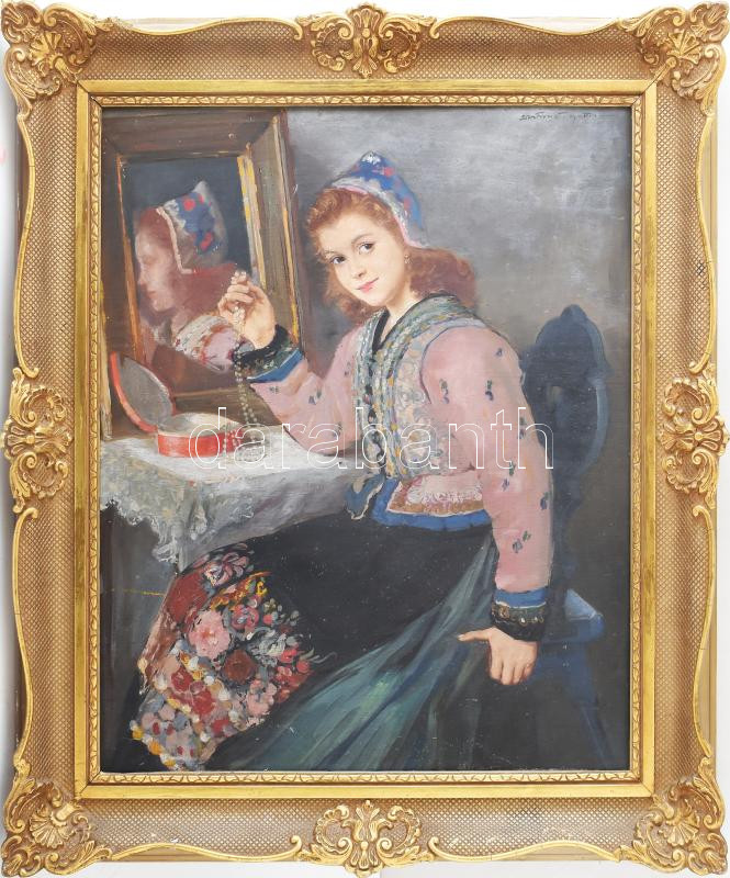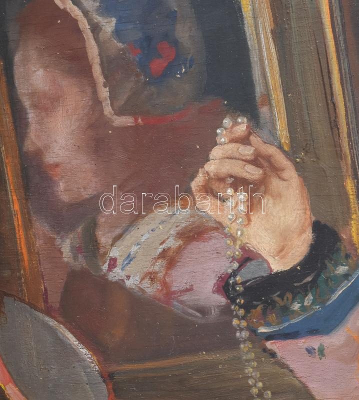 Szánthó Mária (1897-1998): Lány gyöngyökkel. Olaj, fa. Jelezve jobbra fent. Dekoratív fakeretben. 60x50 cm / Mária Szánthó (1897-1998): Lady with pearls. Oil on wood, signed upper right. Framed. 60x50 cm.