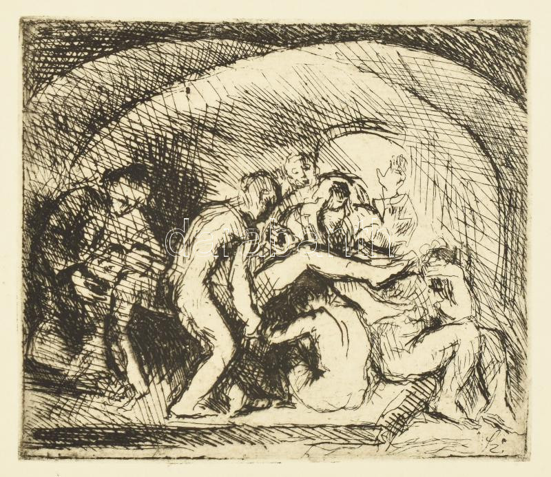 Leírás: Szőnyi István (1894-1960): Sírbatétel. Rézkarc, papír, jelzett a karcon, hátoldalán Palota Galéria bélyegzőjével, 7,5×8,5 cm