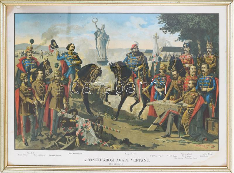 Leírás: Bellony(i) László (1871-1913) festménye után: A tizenhárom aradi vértanu, 1849 október 6. Kromolitográfia, papír. Jelzett a litográfián: Bellony Laszlo 900. Dekoratív, üvegezett fakeretben. Lapszéli ázásfoltokkal. 49x67 cm