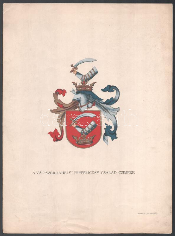 Leírás: cca 1900 A vág-szerdahelyi Prepeliczay család címere. Litografált címerrajz 10x16 cm, lap 25x35 cm