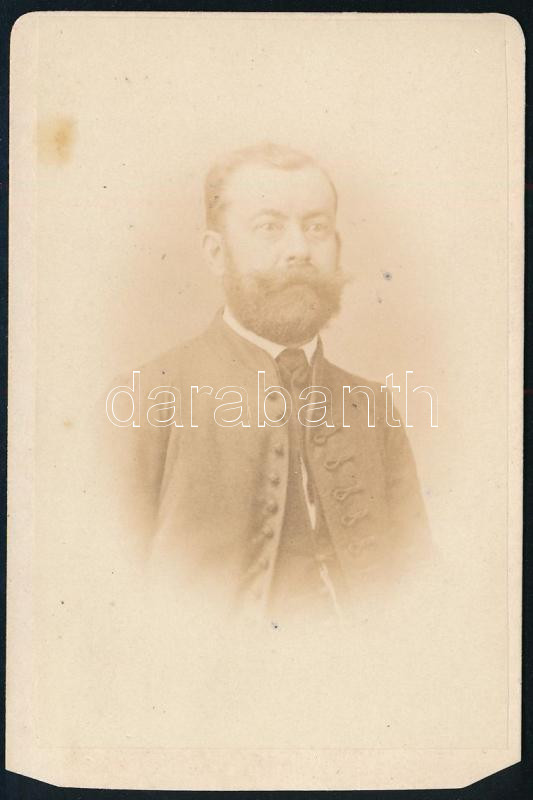 1865 Ráth Károly (1829-1868) történész, levéltáros, az 1848/49-es forradalom és szabadságharc résztvevője (a 23. honvédzászlóaljban hadnagy, főhadnagy, majd Kmety György hadsegéde volt); vizitkártya Schrecker Ignác (1834-1888) pesti műterméből, alja vágott, 9,5x6 cm