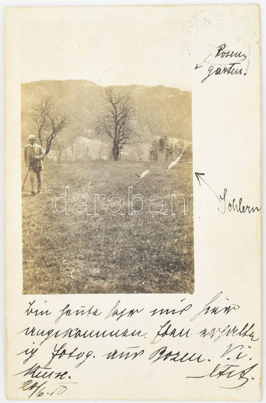 1910 Czullik Betti, Czullik Ágost, a Liechtenstein hercegi kertek igazgatója lánya részére szóló fotólap, német nyelven, oroszvári és győri bélyegzésekkel, a képeslapon: Rosengarten - Schlern (Dolomitok?), 14x9 cm
