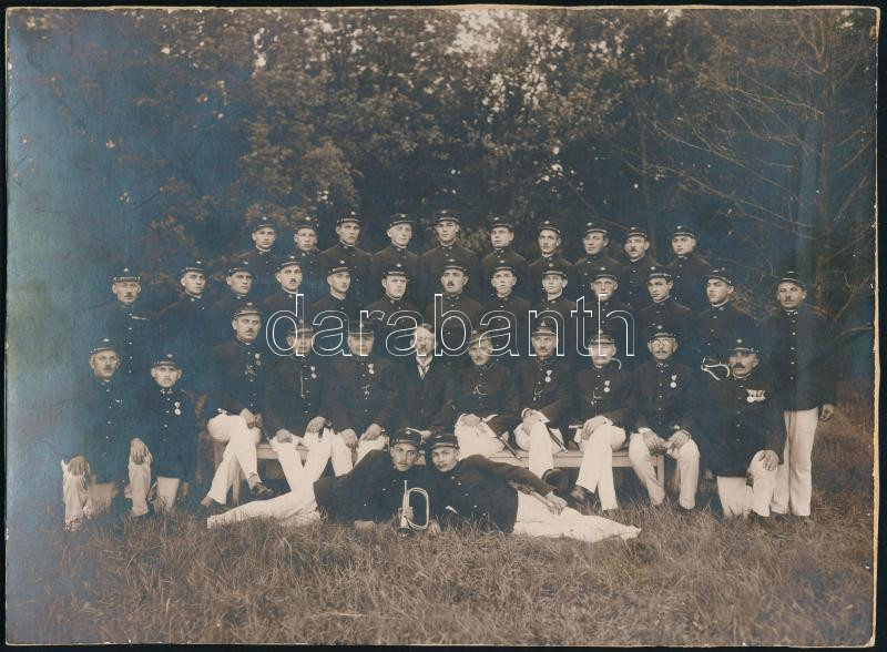 Leírás: 1930 Mezőberényi Önkéntes Tűzoltó Egyesület, kartonra ragasztott fotó, hátoldalon feliratozva, 16,5×22,5 cm