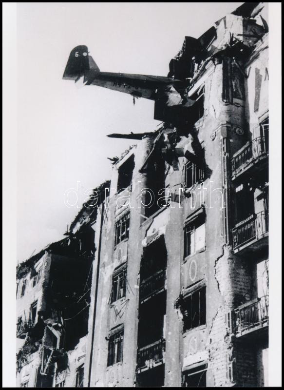1945 Budapest, Jevgenyij Haldej (1917-1997) haditudósító felvétele egy Budapest felett lelőtt repülőgépről, amely a lakóházak tetején ,,landolt", 1 db modern nagyítás, jelzés nélkül, hírügynökségi fotó nyomán, 21x15 cm