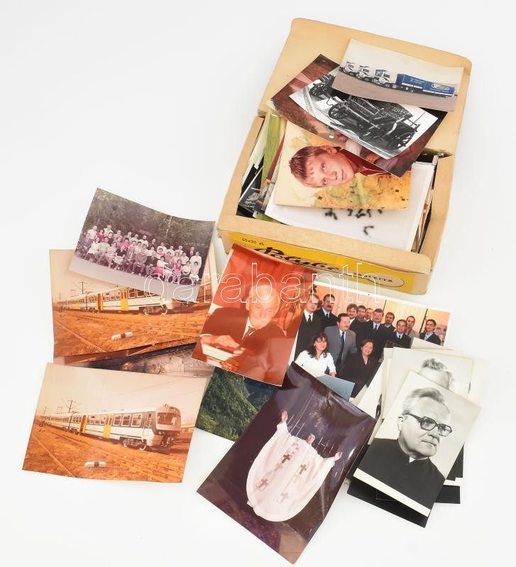 Leírás: Egy doboznyi (kb. 470 db) vegyes fotó, közte vonatokat, repülőgépeket ábrázolók, tájképek, családi fotók, stb.