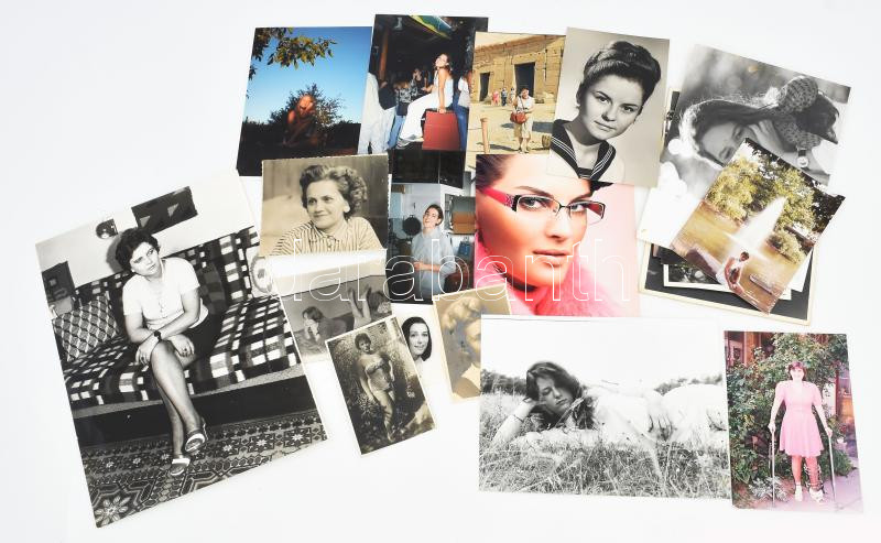 Leírás: Hölgyeket, lányokat ábrázoló, vegyes régi és modern fotók, össz. 21 db, változó méretben és állapotban