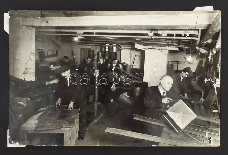 Leírás: Járai Rudolf (1913-1993): Munka a műhelyben, pecséttel jelzett fotó, felületén törésnyomokkal, kopásnyomokkal, 12×18 cm