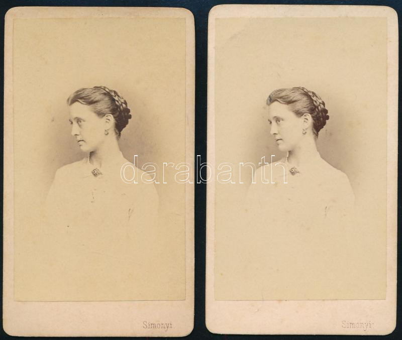 Leírás: cca 1860 Fiatal hölgy divatos brossal, 2 db azonos portré, vizitkártya Simonyi pestii műterméből, 10,5x6 cm