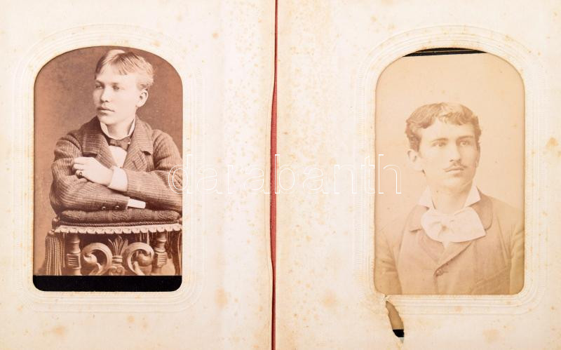 cca 1865-1880 Régi réz veretes bőrkötéses fotóalbum 21 db keményhátú fotóval, női és féri, katona és gyerekportrékkal, fotóméret: 10,5×6,5 cm, album sérült: 14,5×11 cm