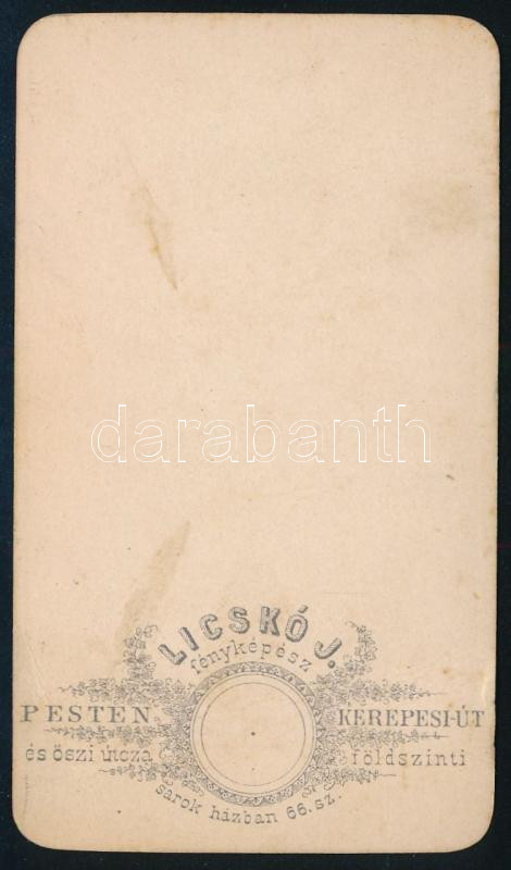 Leírás: cca 1865 Női portré, keményhátú fotó Licskó János pesti műterméből, 10,5×6,5 cm