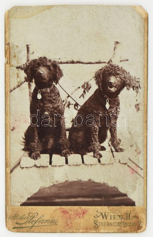 cca 1890-1900 Lyon és Lady n. kutyák (uszkár?) portréja, hátoldalán feliratozott keményhátú fotó Atelier Stefanie bécsi műterméből, kissé foltos, szélén vágott, 10x6,5 cm