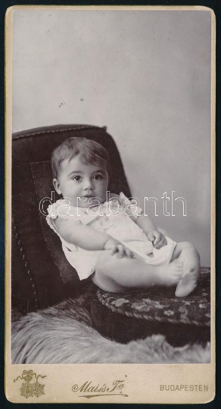 Leírás: cca 1900 Babaportré, keményhátú fotó Mai és Társa budapesti műterméből, 15x8 cm
